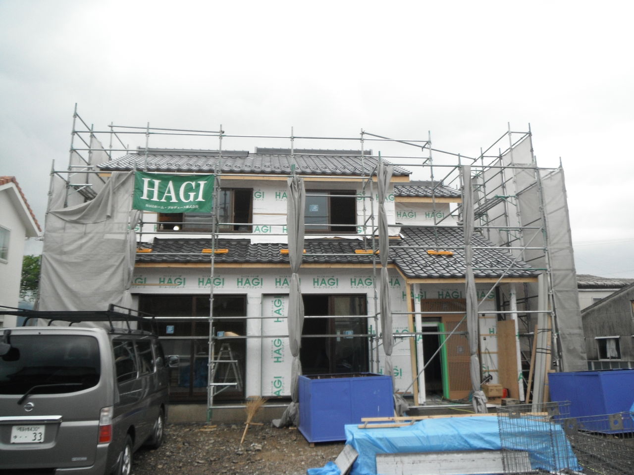 【只今施工中】・・・「和を取り入れた家族こだわりの家」更新しました。 2013年04月30日 屋根工事が完了しました!現在、外部は外壁工事中です!内部はプラスターボード工事中です!本日は天井面の吹き付け断熱を行いましたHAGI やの